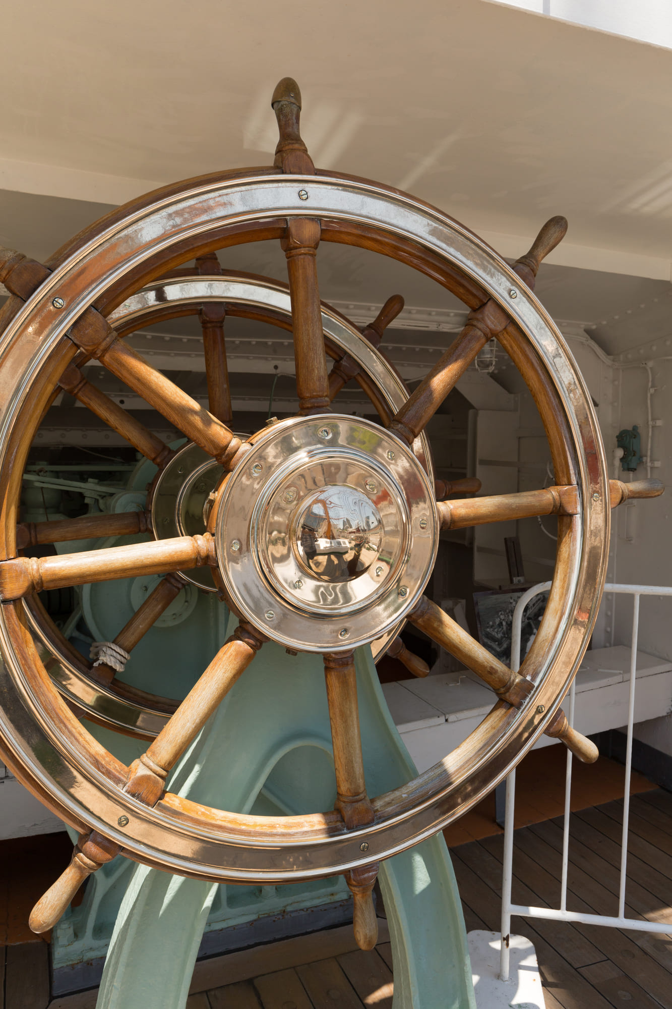 水中の板そのものを舵と呼ぶと同時に、船の操縦者である「操舵手」が操作する輪状の操作部も舵、または「操舵輪」と呼ばれます。また、操舵手が舵を操作することを「操舵(そうだ)」と呼びます。